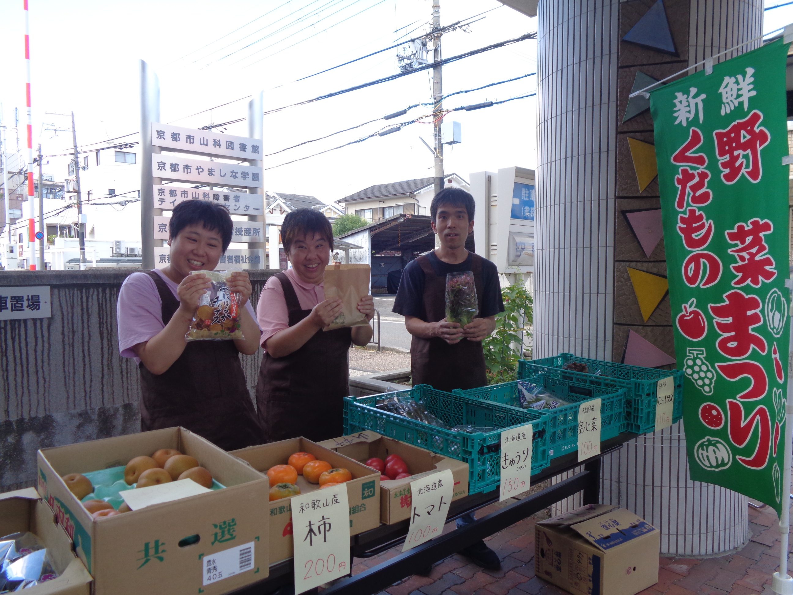 地域の福祉施設で作っている野菜や京都の旬野菜などとともに、中央市場から朝一番で仕入れた野菜を毎週火曜日、10:00~1階駐車場にて販売しています。