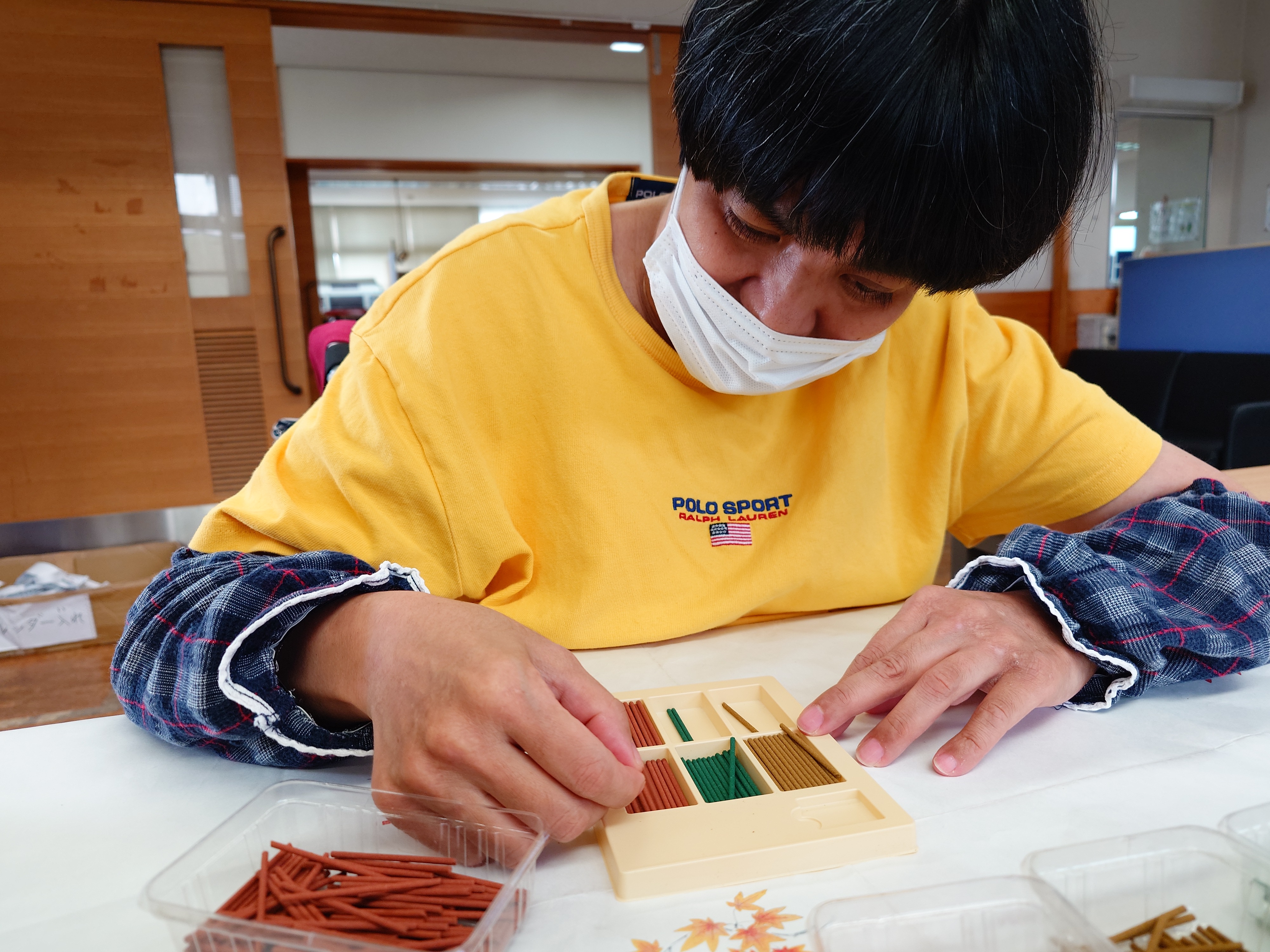 自助具を活用したり、絵や文字のカードを用いたコミュニケーション支援のPECSや、様々な角度から持っている力を評価するTTAPを取り入れ、生産活動(作業)を活動の中心に据えながら、創作や余暇活動など、利用者一人ひとりのペースに合わせて取り組めるようプログラムを組み立てています。